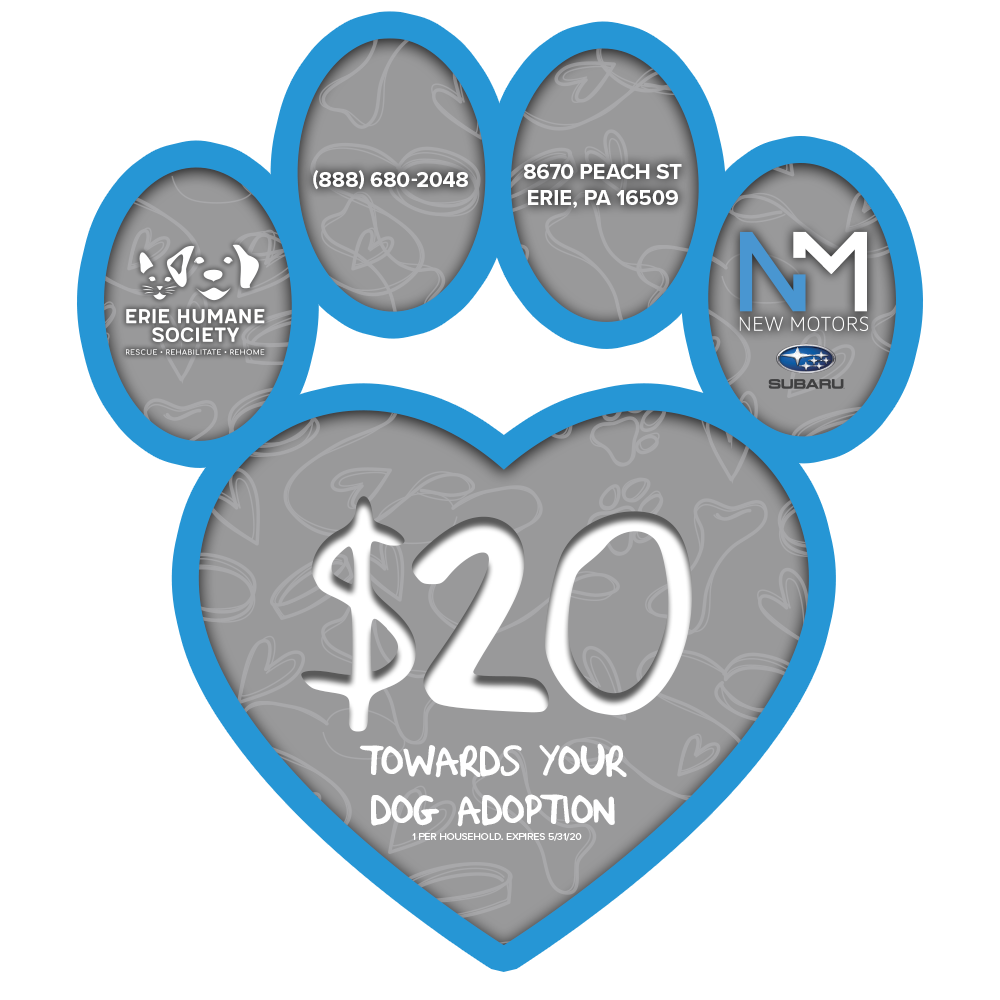 At New Motors Subaru in Erie, PA, we're offering up dog & cat adoption vouchers for the Erie Humane Society. Help spread the love and give these animals the love and care that they deserve. To download the vouchers, please just click the buttons above. These vouchers are limited to 1 per household & expire 5/31/20. Please contact the dealership for more details.